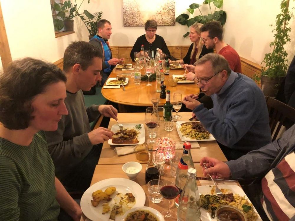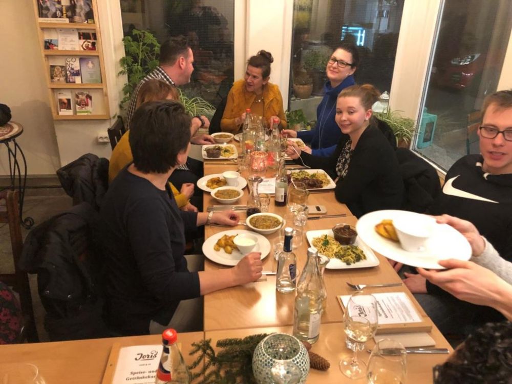 In den schönen Räumen des Restaurants haben wir uns sehr wohl gefühlt und sind auch essensmäßig wunderbar versorgt worden. Das Essen war sehr lecker und wird mit ausgesuchten Bio-Produkten zubereitet. An diesem Abend wurde auch sichtbar, dass sich das FSP-Team auch im letzten Jahr wieder deutlich vergrößert hat. Im Laufe des letzten Jahres sind 15 neue Mitarbeiterinnen und Mitarbeiter zu uns gestoßen. Darüber sind wir sehr froh und dankbar, weil die Arbeit in allen Bereichen - Verwaltung, Hauswirtschaft und auch in der Pflege - deutlich zugenommen hat. Die Gesamtzahl der Mitarbeiterinnen und Mitarbeiter ist dadurch auf 26 angewachsen. Dies zeigt, dass unsere stetigen Bemühungen, für gute Arbeitsbedingungen in unserer Einrichtung zu sorgen, weiterhin Früchte tragen.